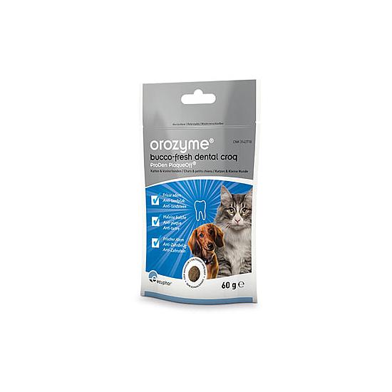 Les friandises dentaires Orozyme Bucco-Fresh pour chiens et chats sont des friandises savoureuses qui aident à lutter contre la mauvaise haleine et conviennent aux chiens et aux chats. 100 % naturelles, ces croquettes constituent un complément alimentaire pour les chiens et les chats souffrant de mauvaise haleine. Elles contribuent à améliorer l’hygiène bucco-dentaire et réduisent les mauvaises odeurs, la plaque dentaire et le tartre. Ce produit constitue donc une excellente alternative au brossage des dents de votre animal.