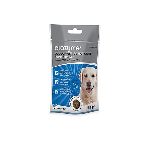 Orozyme Bucco-Fresh Dental Croq Chien 10+ kg est une friandise savoureuse qui aide à lutter contre la mauvaise haleine et convient aux chiens de 10 kg et plus. 100 % naturelle, cette croquette constitue un complément alimentaire pour les chiens souffrant de mauvaise haleine. Elle contribue à améliorer l’hygiène bucco-dentaire et réduit les mauvaises odeurs, la plaque dentaire et le tartre. C’est une bonne alternative au brossage des dents de votre animal.