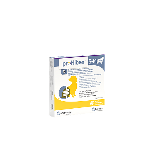 ProHibex est un aliment complémentaire pour chiens qui contient des liants naturels, des probiotiques, des prébiotiques, des vitamines et des bêta-glucanes.